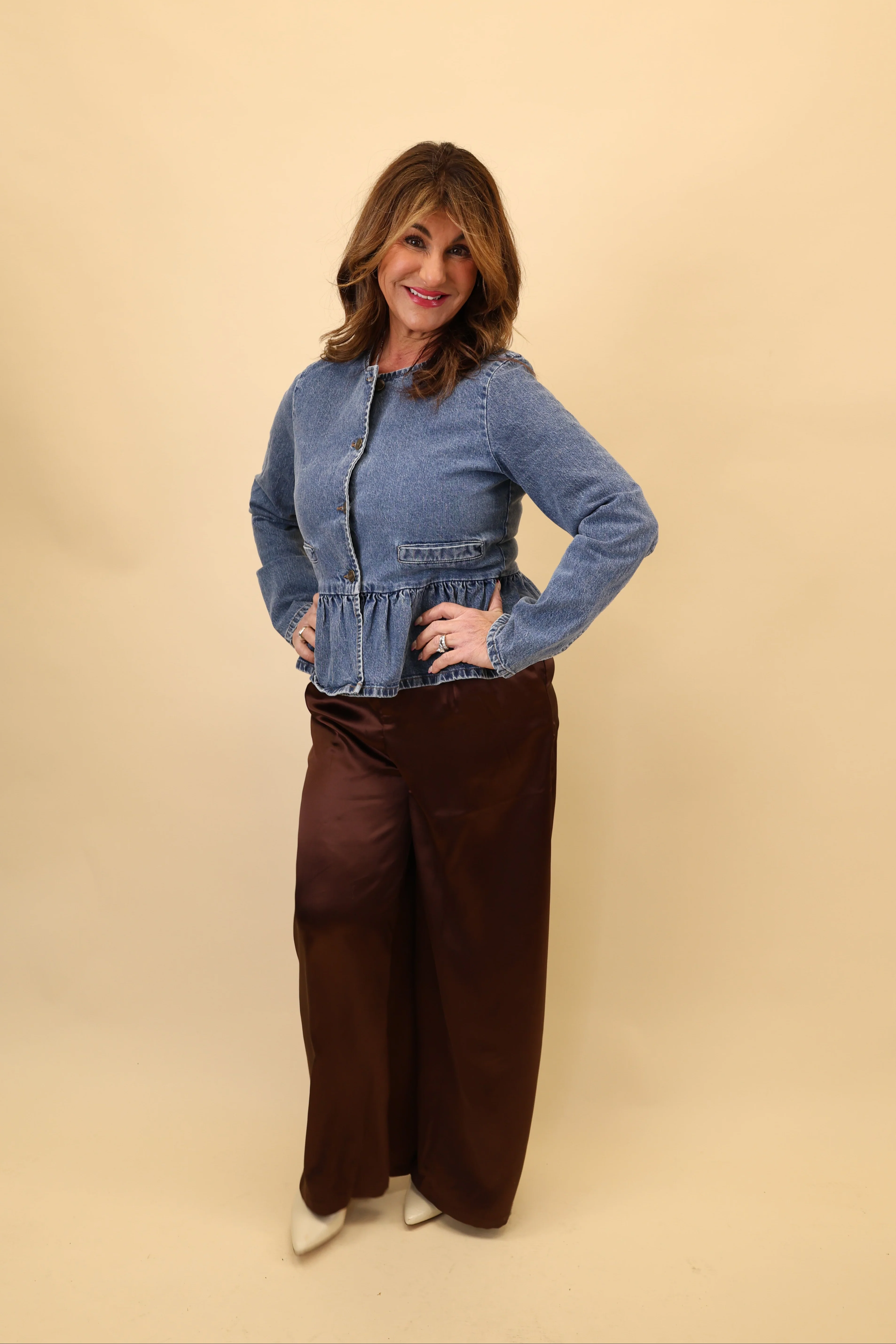 Tailored with a feminine twist, the Abigale Peplum Blazer adds instant polish. Crafted in a dark navy denim wash, it features a structured fit with a subtle peplum hem to highlight your waist while keeping the look elevated and modern.