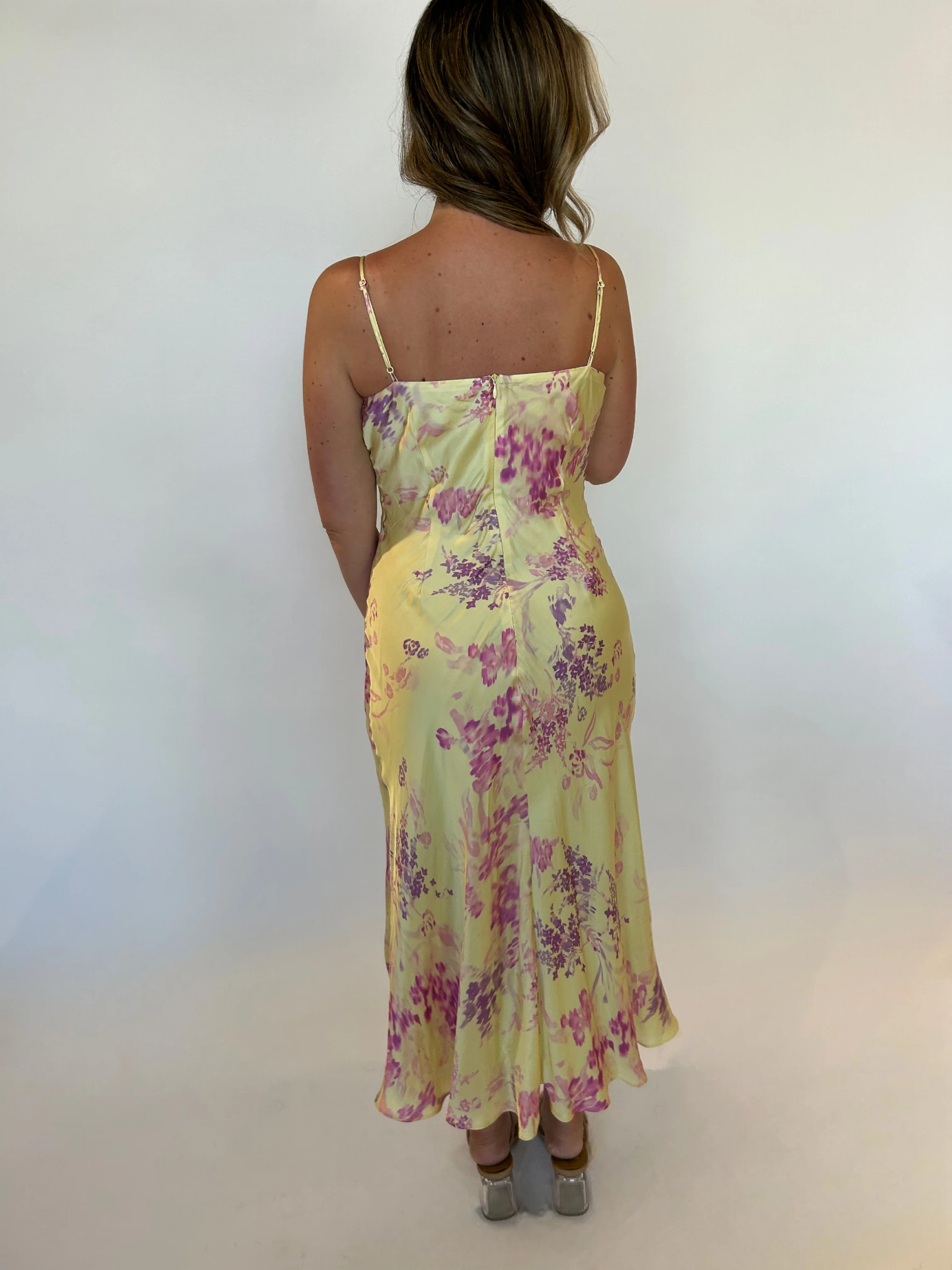 Slip into elegance with this silky satin pastel floral dress! Featuring delicate spaghetti straps, a draped cowl neck, and a flowy midi-length skirt, it’s the perfect blend of chic and effortless. Dress it up with heels for a special occasion or keep it casual with sandals—either way, this dreamy dress is your new spring essential!