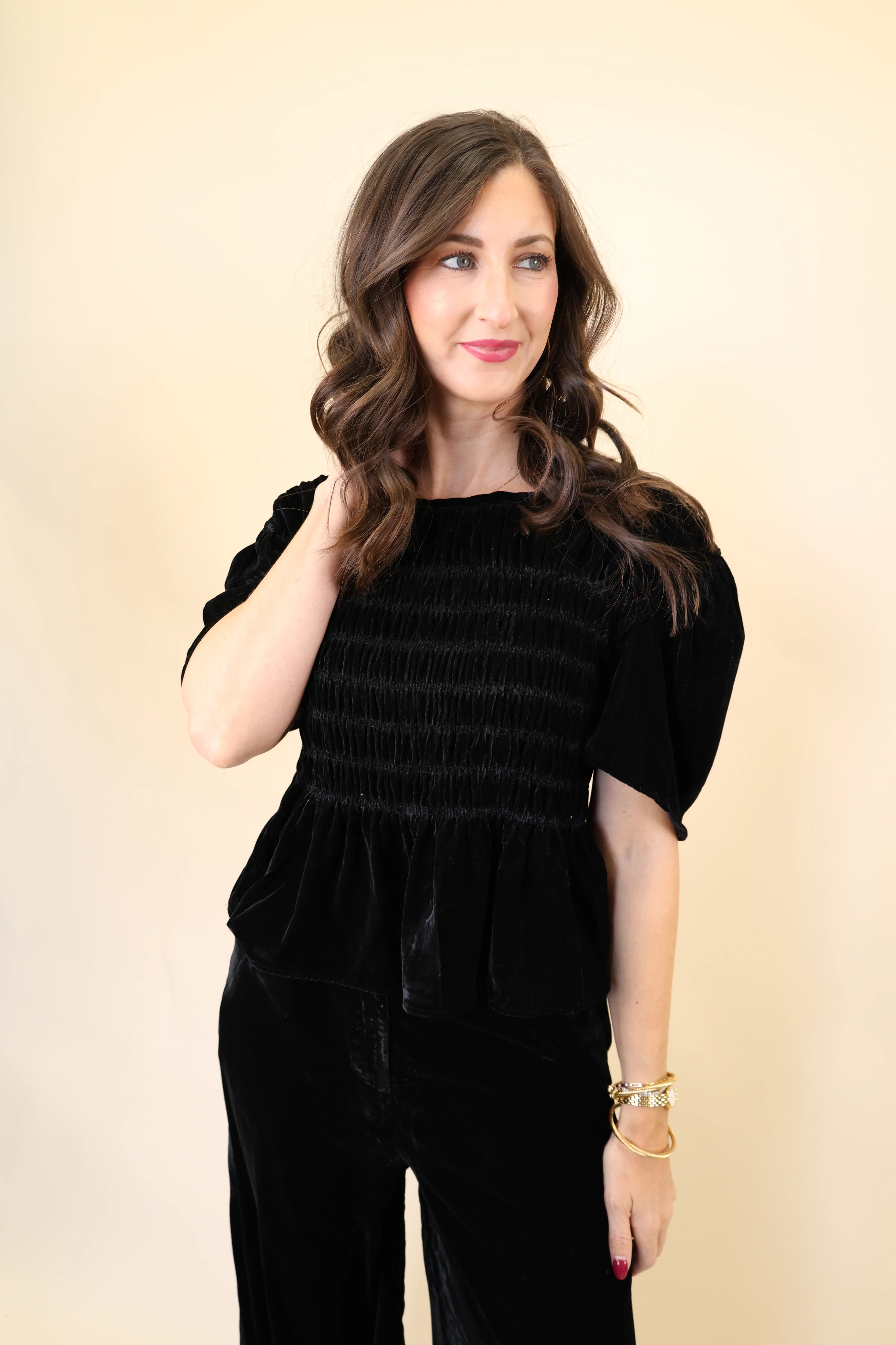 Smocked gathers and a flounced peplum sweeten the style story of this stretch-velvet top that gives even a casual look a special luminous glow.