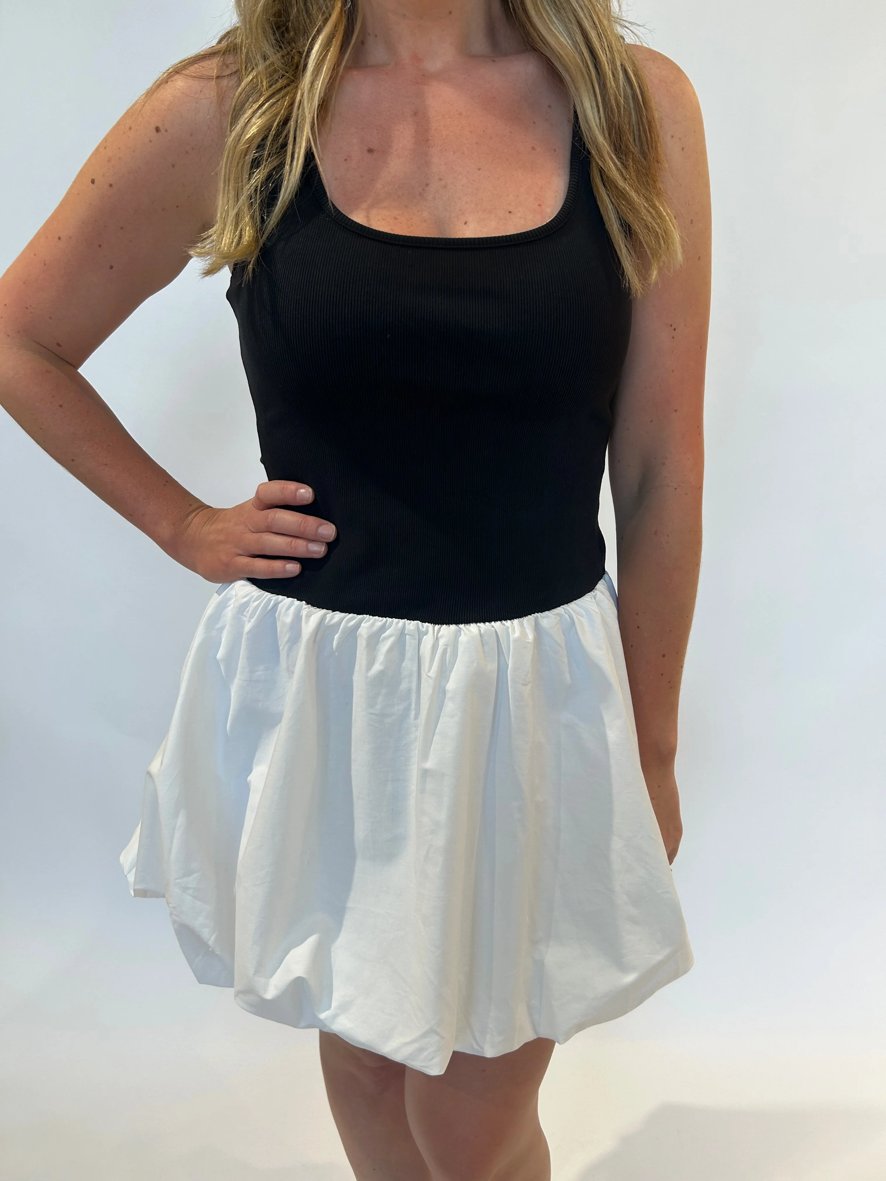 Bold contrast meets effortless style! This dress features a sleek black fitted tank top paired with a white balloon-hem short skirt for a chic, statement-making look. Versatile enough for any event—dress it up with heels for an elegant vibe or keep it casual with sandals for a laid-back feel.
