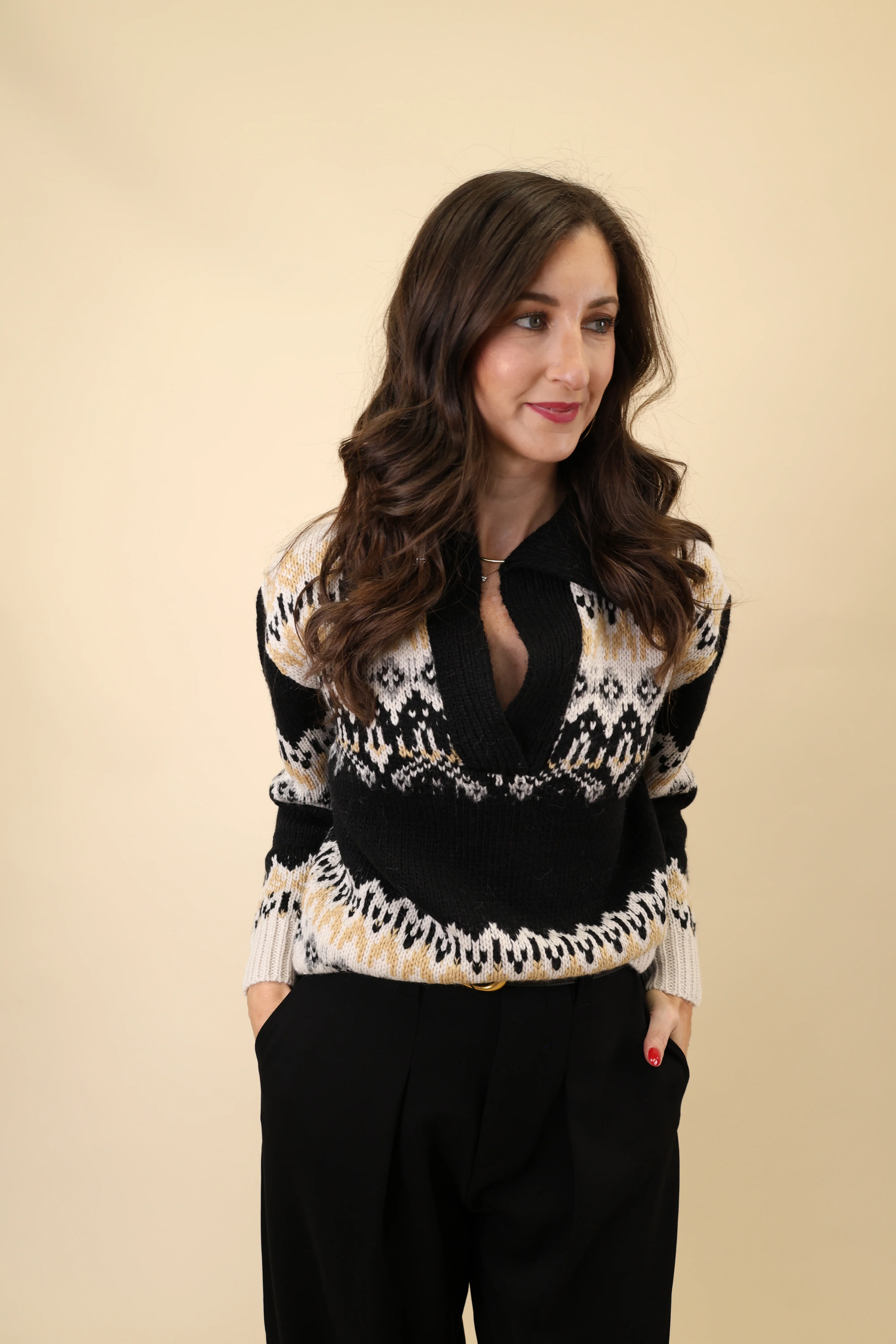 Meet your new winter favorite. The Malana Fair Isle Sweater blends classic alpine charm with a modern, elevated fit. Designed with a flattering V-neck and a soft folded collar, this cozy knit features a stunning Fair Isle pattern in black, tan, grey, and white—making it perfect for everything from après-ski to festive weekend plans.