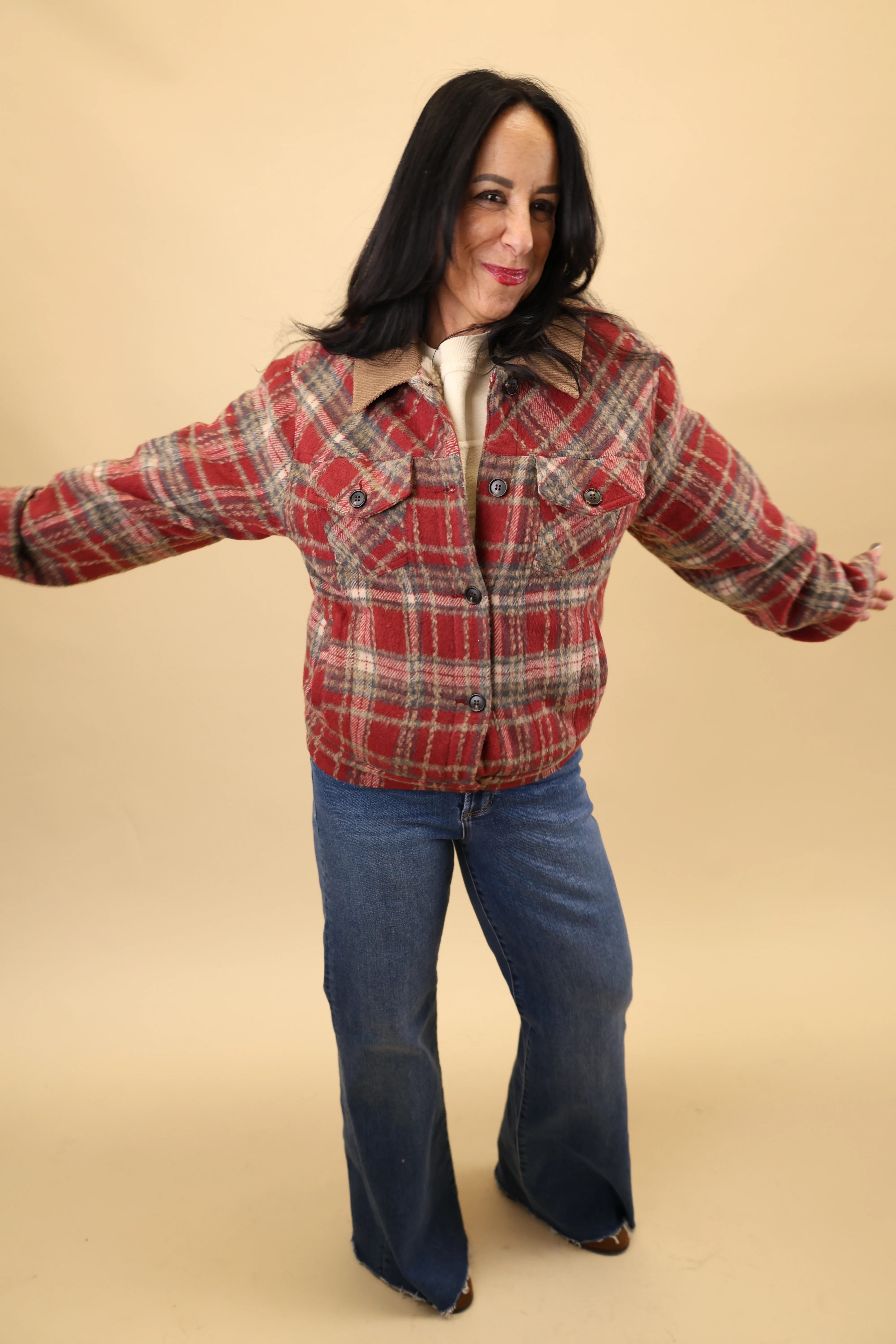 Red plaid jacket. Button front long sleeve finished with front welt pockets, cuff & waistband. Medium wash comfort stretch denim on standard fit, styled with metallic logo shank buttons.