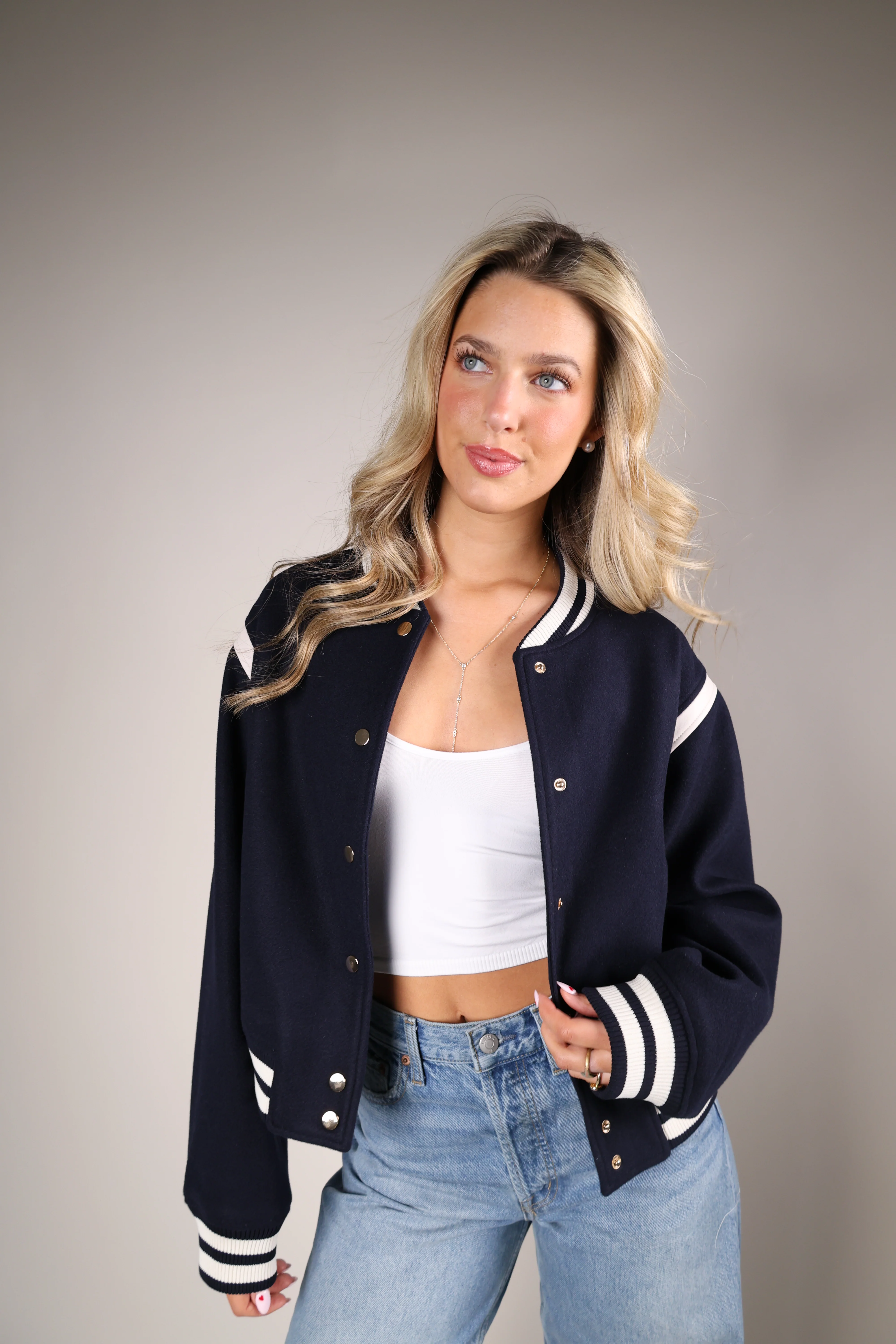 Classic yet contemporary, this varsity jacket brings polished ease to a casual staple. Designed to transition seamlessly from day to night, it pairs just as well with relaxed separates as it does with elevated layers for a versatile, dress-up or dress-down finish.
